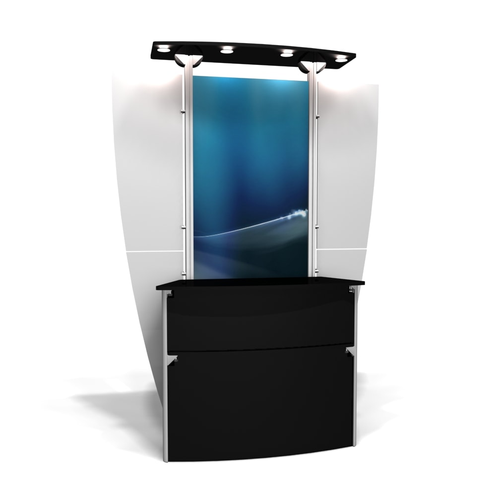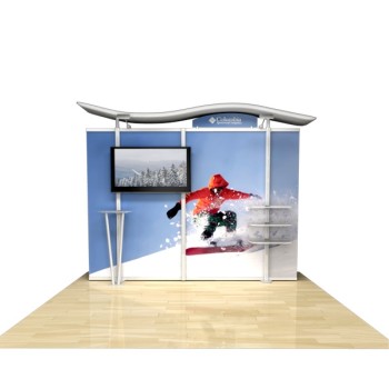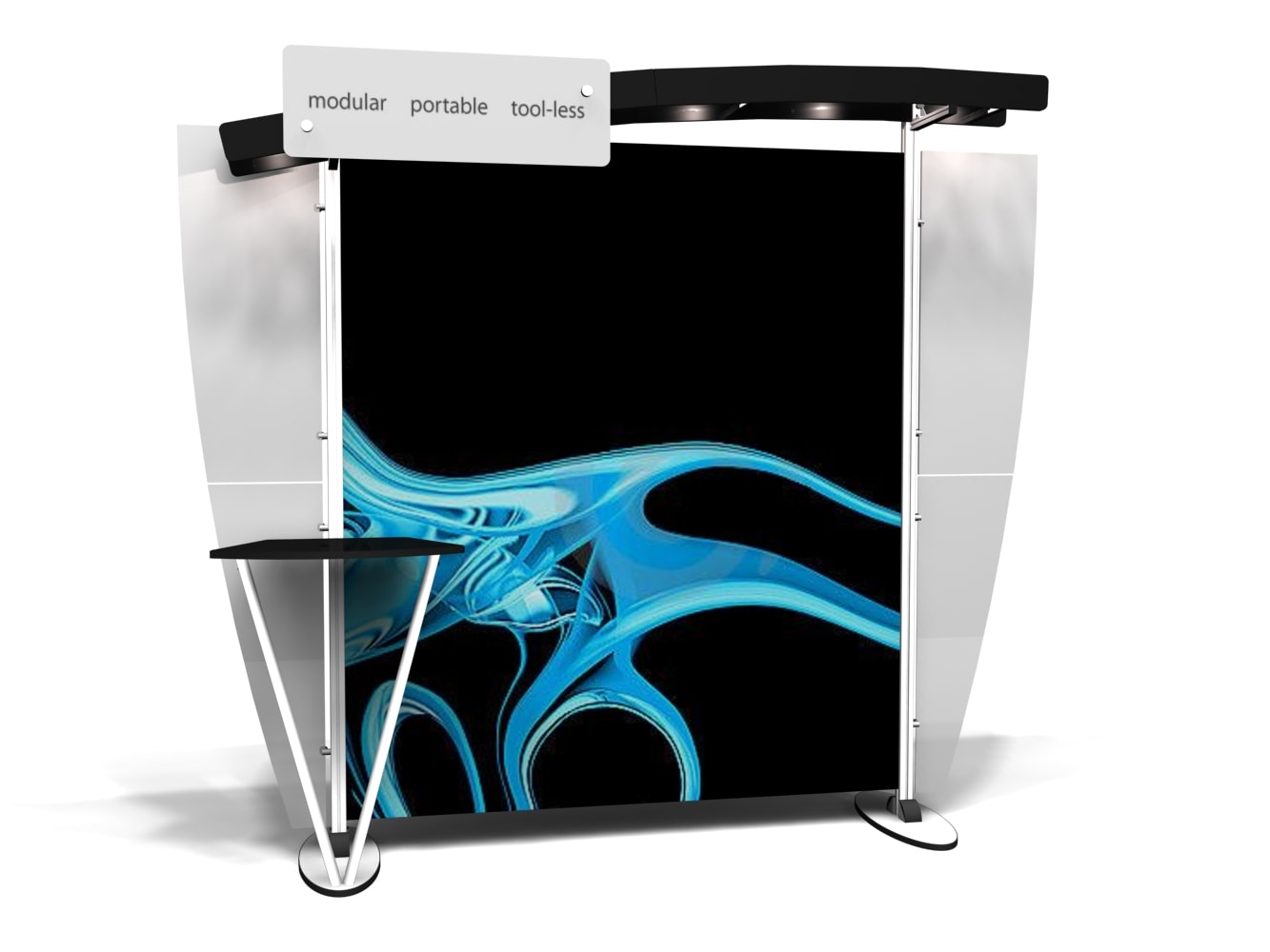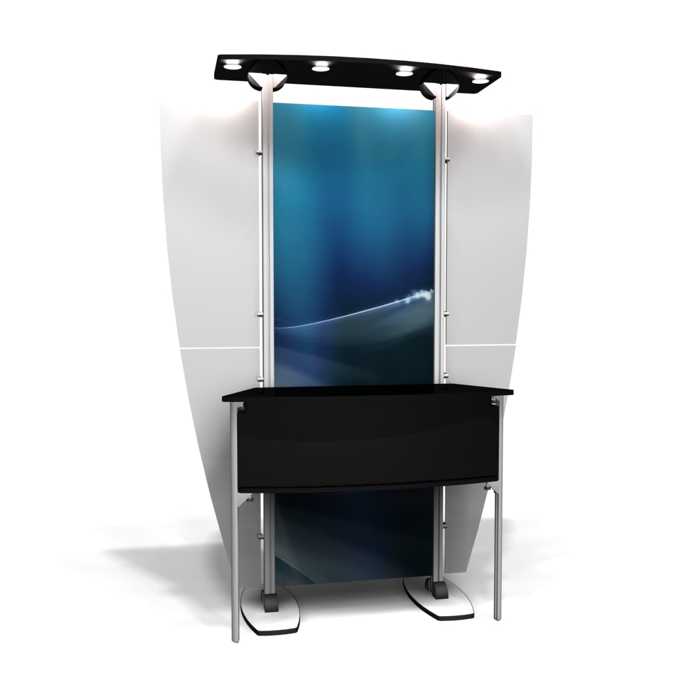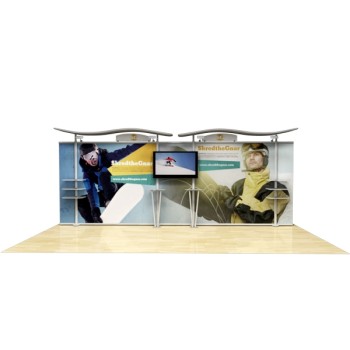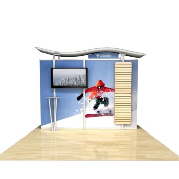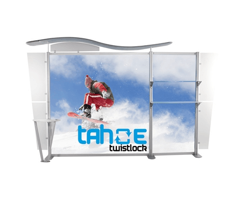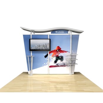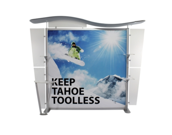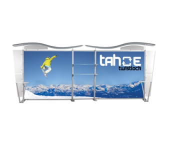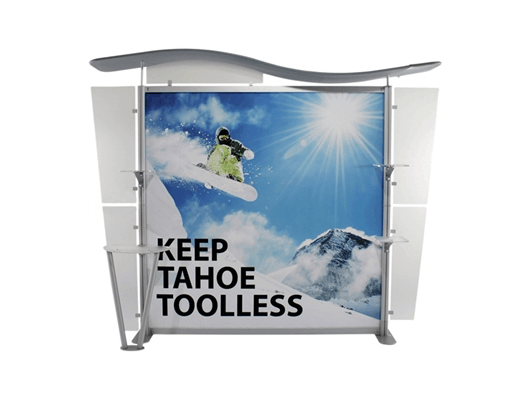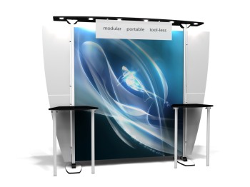 Besides being pragmatic, there is an urbane charm to the display. Bordered with translucent acrylic, the sleek frame is made out of lightweight aluminum. Acrylic components include shelves, a table, and printable side wings. An undulate canopy, literally, tops it off. And, custom graphics boldly take center stage, giving potential to attract a convivial audience.