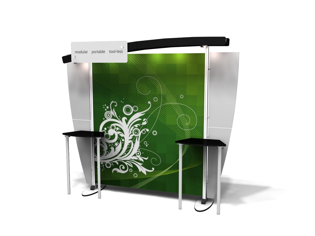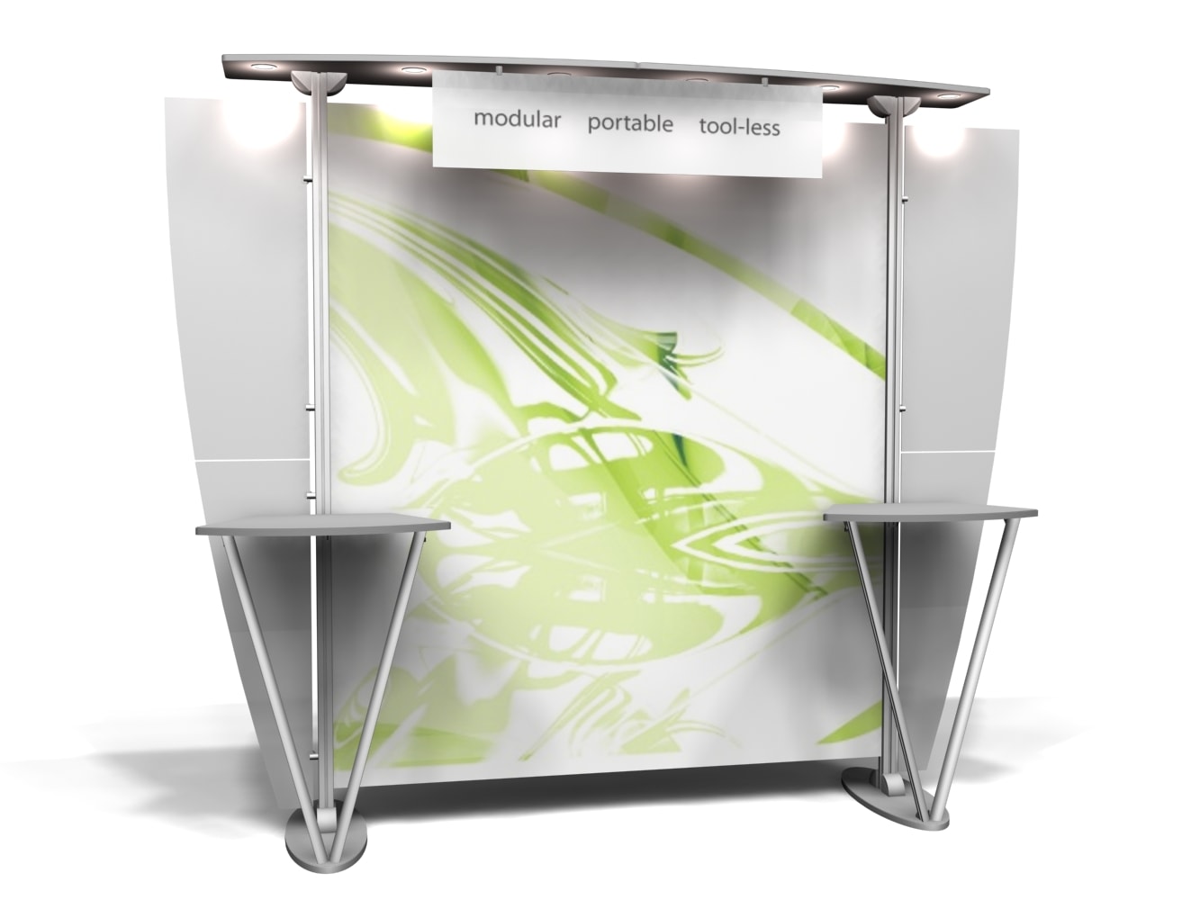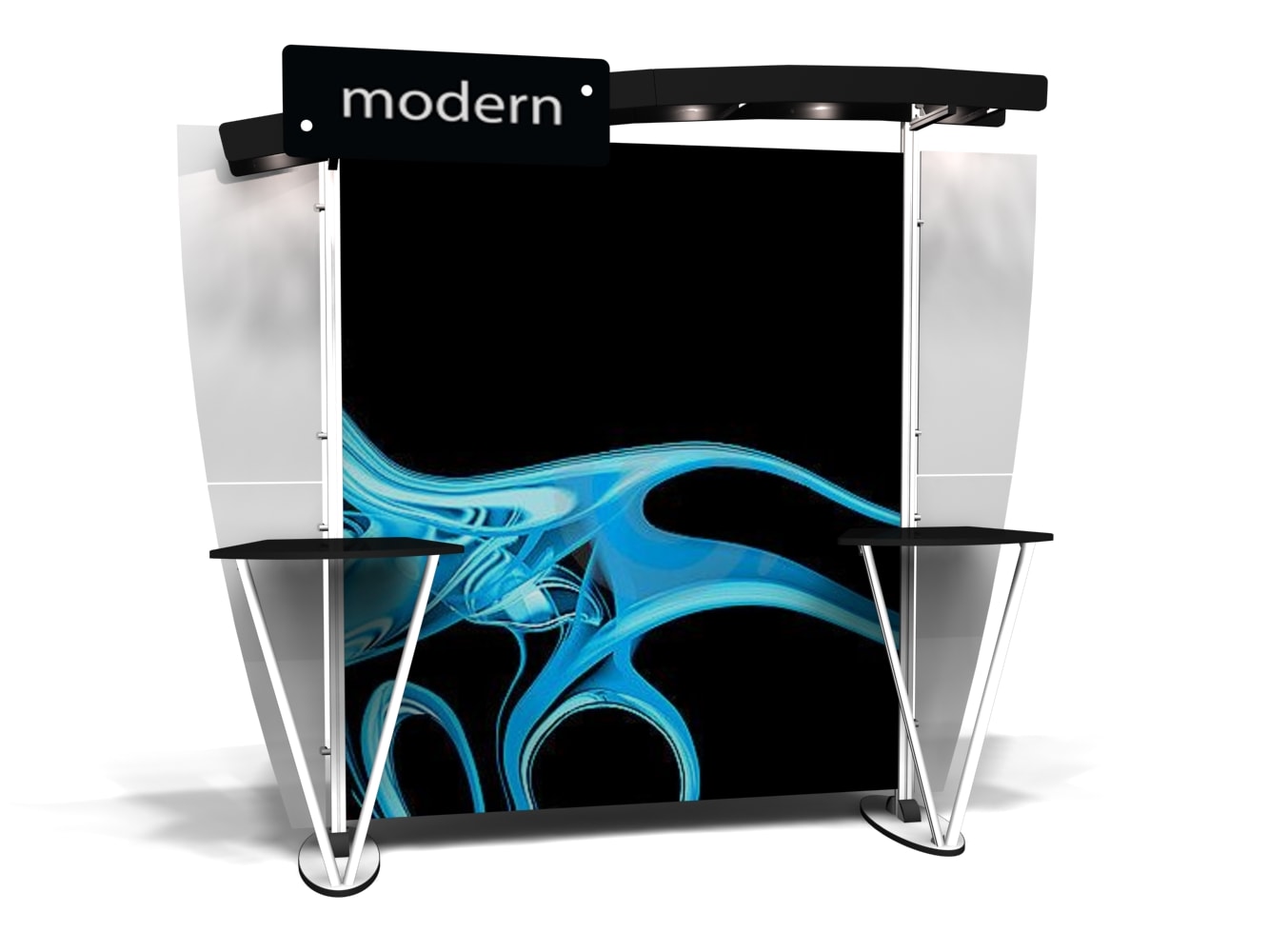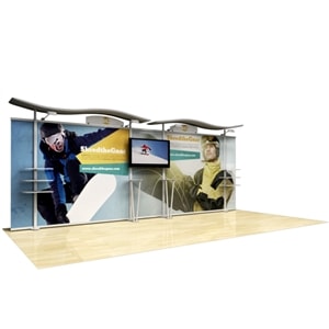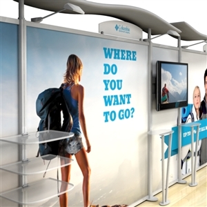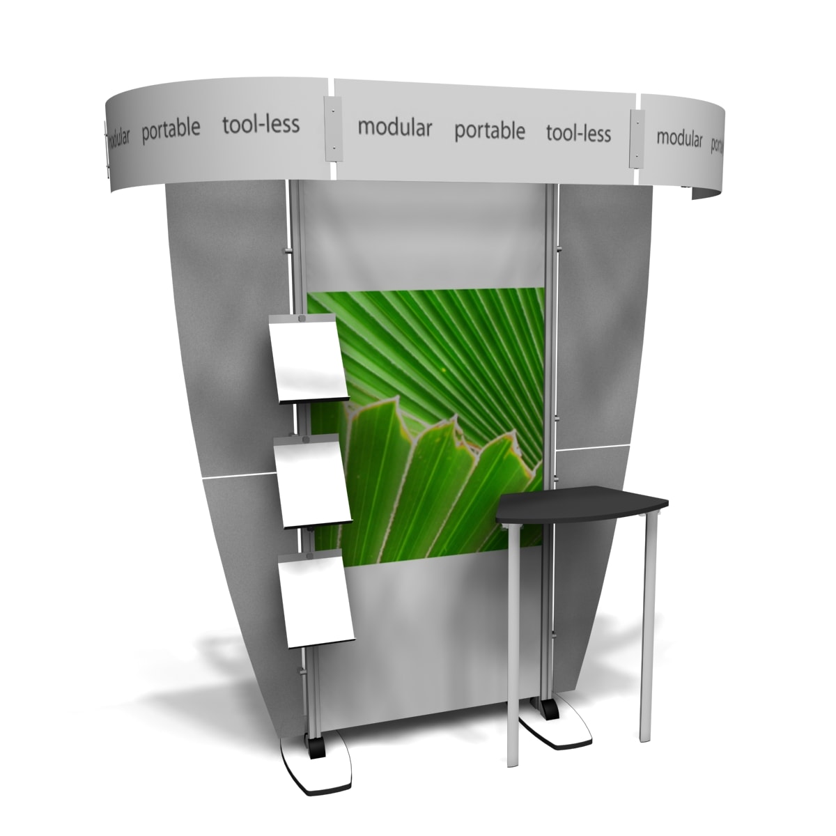 Besides being pragmatic, there is an urbane charm to the display. Bordered with translucent acrylic, the sleek frame is made out of lightweight aluminum. Acrylic components include shelves, a table, and printable side wings. An undulate canopy, literally, tops it off. And, custom graphics boldly take center stage, giving potential to attract a convivial audience.