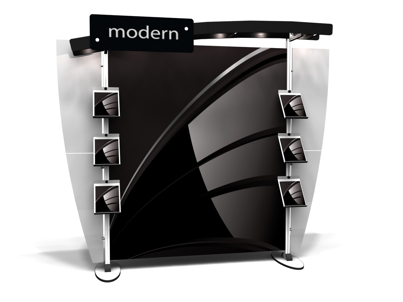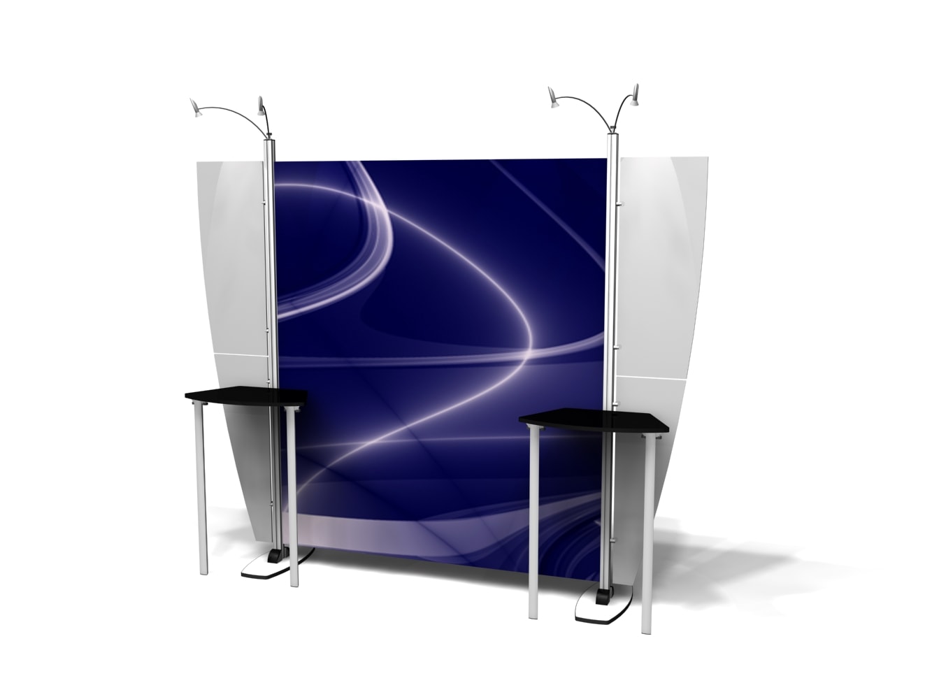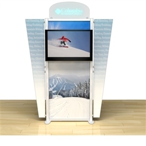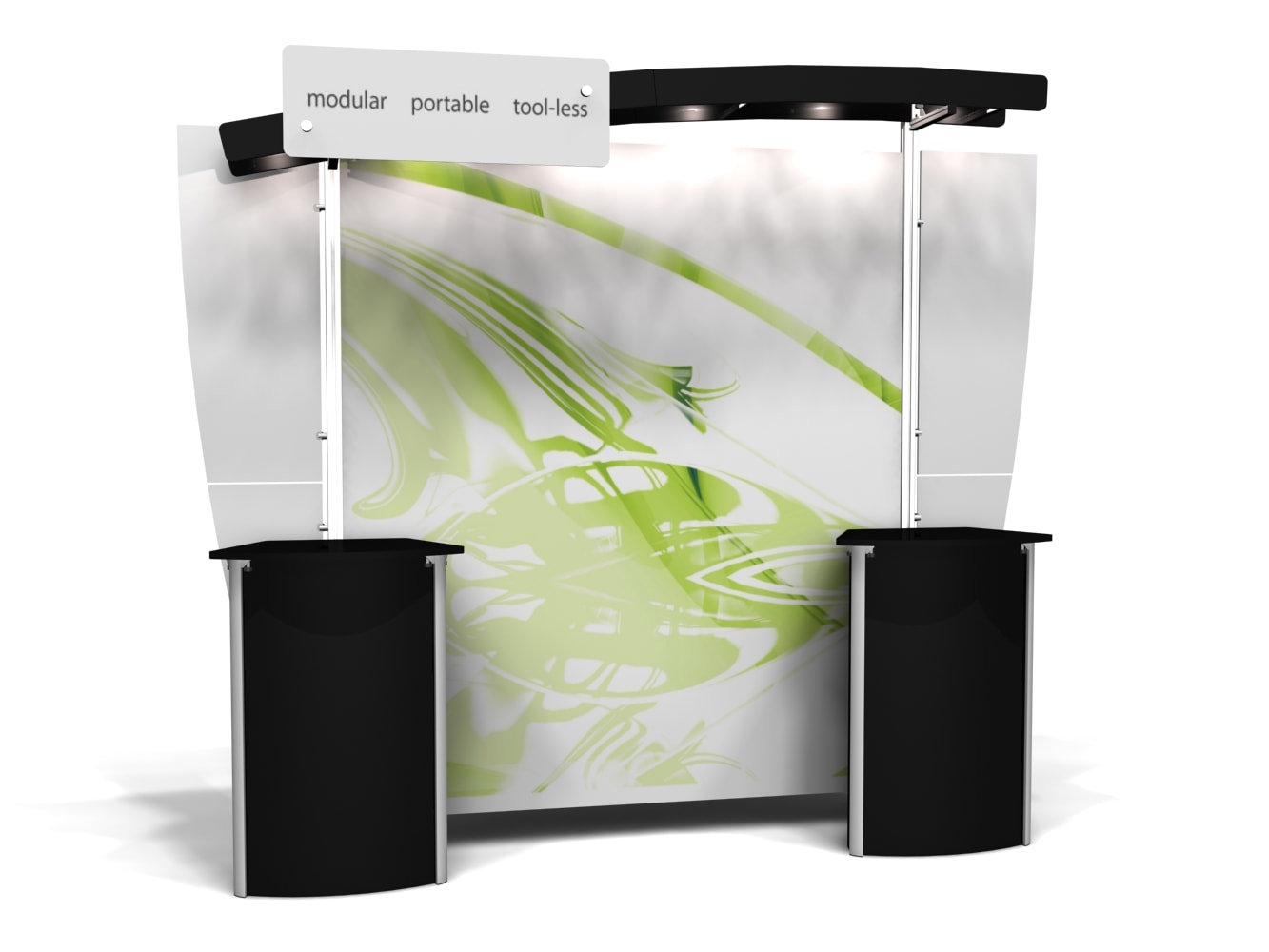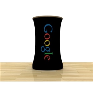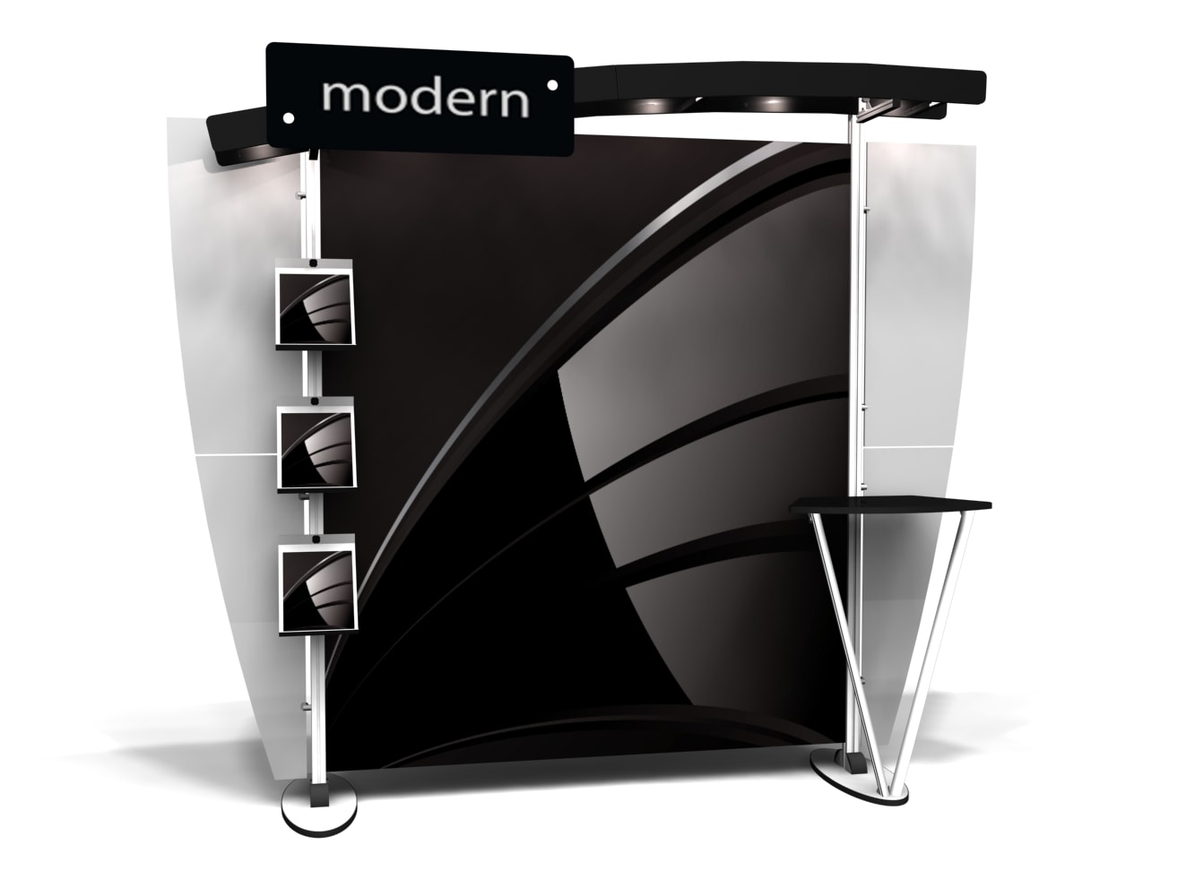 Besides being pragmatic, there is an urbane charm to the display. Bordered with translucent acrylic, the sleek frame is made out of lightweight aluminum. Acrylic components include shelves, a table, and printable side wings. An undulate canopy, literally, tops it off. And, custom graphics boldly take center stage, giving potential to attract a convivial audience.